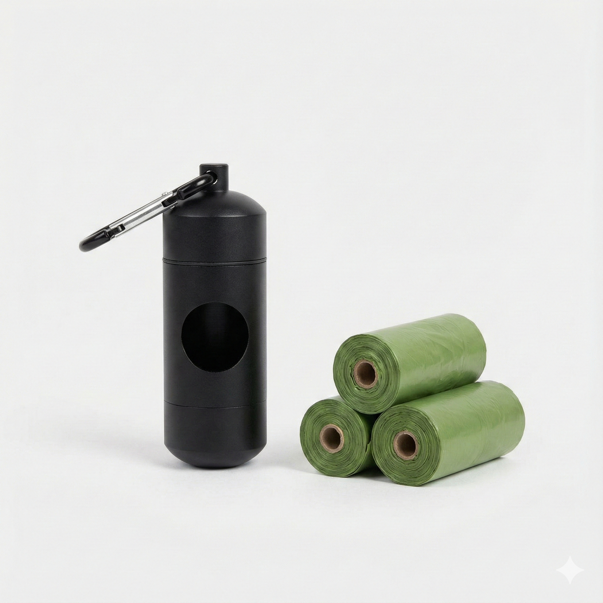 Even the unglamorous parts of dog ownership should look good. This kit includes our sleek, cylindrical aluminum bag dispenser that clips securely to any leash, plus 6 rolls (90 bags) of extra-thick, compostable waste bags.